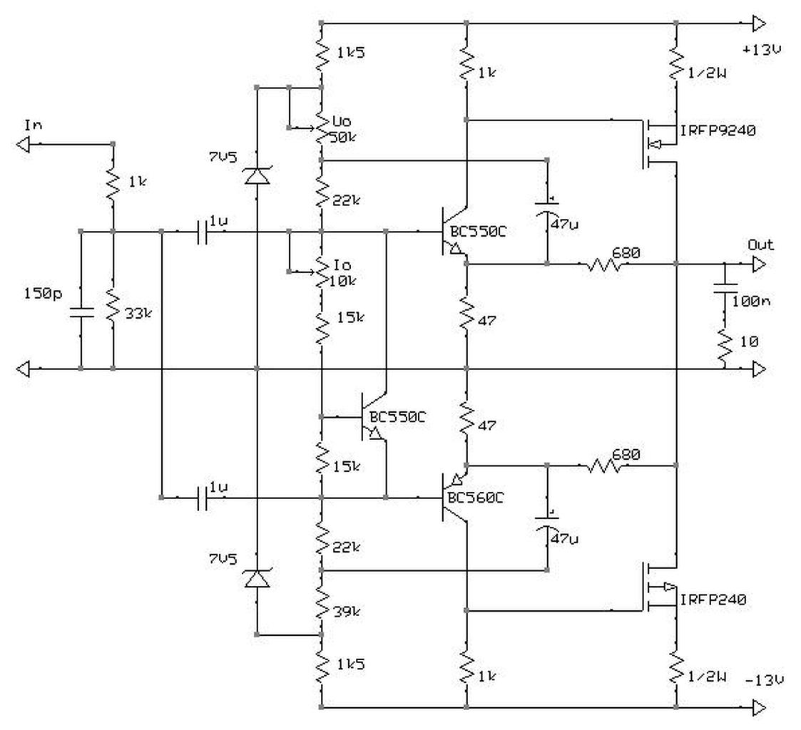 Ennek a kapcsolásnak nagyon kicsi a kivezérelhetősége, mivel a fetek Source-követő kapcsolásban vannak az áramkörben. Az UG-S feszültségük kb. 4V, ami benne marad a végfokban sajnos, ennyivel kevesebbre jön ki a max. kivezérelhetőség.