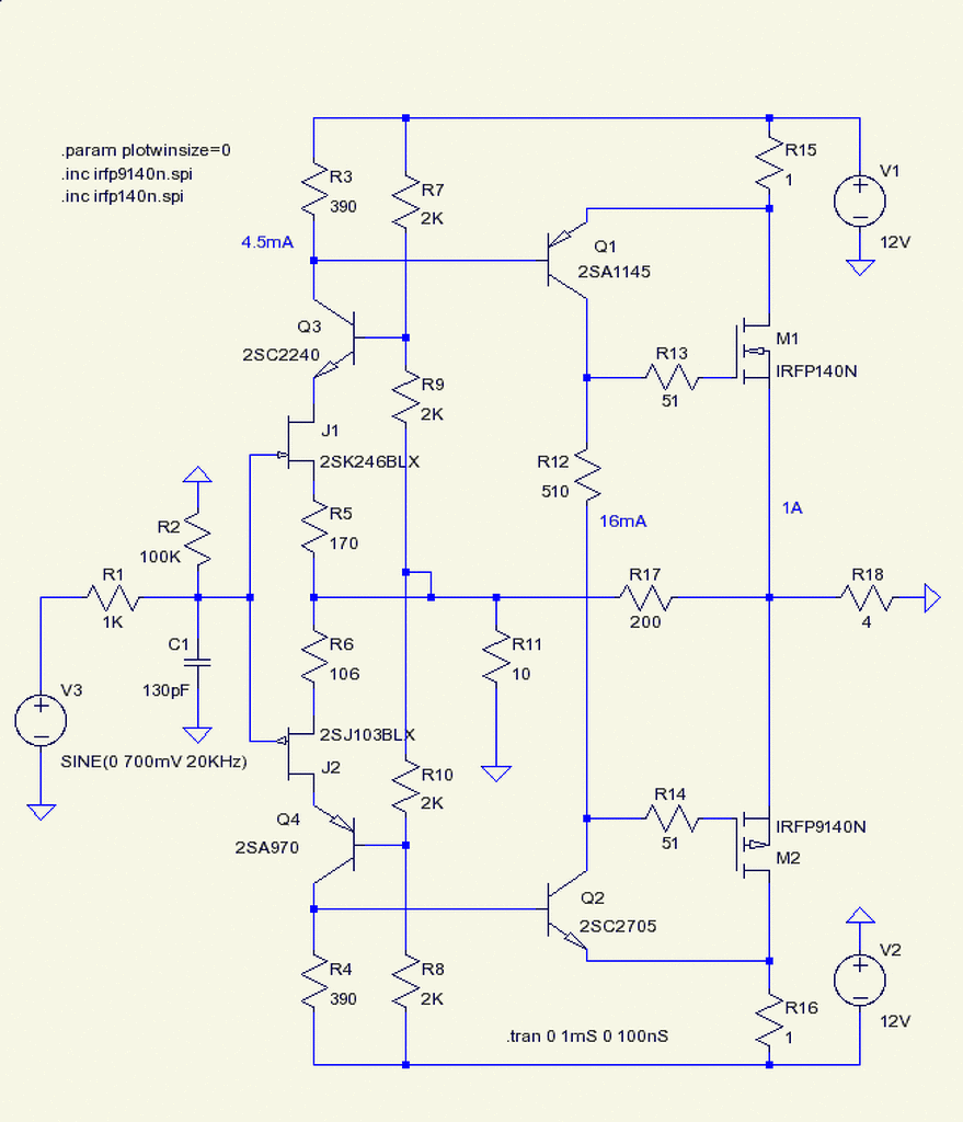 Köszi a válaszod s nagyon örülök, hogy kipróbáltad szimulátorban. Hiragáéhoz hasonló nyugalmi áram beállításra gondoltam, 0.6A értékre (erre is kíváncsi lennék). Az nagyszerű, hogy ily kis nyugalmi áramnál sem rossz. Egy kicsit kibővíve a kapcsolást 2 tranzisztorral, talán javulna. Ha időd és kedved van hozzá, akkor ez utóbbi kapcsolás 200mA és 0.6A-es nyugalmi áram alatti viselkedést is megköszönném.