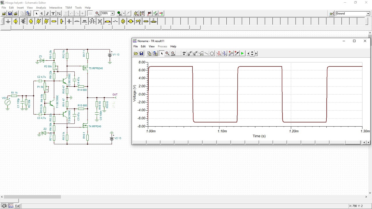 Szimuláltam Tinában, nem rossz, de igazából meg kellene hallgatni. Nem írtál nyugalmi áramot, hogy mi a koncepció, beállítottam 200mA -re. A sávszélessége több, mint elég, a -3dB -es pont valahol 450kHz körül van. Kis jelnél elfogadható, 0,01% körüli a THD, ami nagy jelnél elég magasra felmegy, eléri a 0,6% -ot. Négyszögjellel szép az átvitel, és meglepően jó még akkor is, ha 2µF -os kondival van megterhelve a kimenet. Ellentétben a teljesen visszacsatolt erősítőkkel, nem begyorsul a kapacitív terhelésre, hanem kicsit belassul, emiatt nincs belengés a felfutó élek után. A teszteket 8kHz -es jelekkel végeztem. A fetek surce ellenállása elég magas, ami miatt 4 Ohm -os terhelés esetén kevésbé vezérelhető ki, elég sok marad a végfokban. 8 Ohm esetén kb 10Vp-p a maximum, utána meredeken emelkedik a torzítás. Képernyőképek csatolva. Persze ez csak szimuláció... és úgyis hallgatva dől el, hogy milyen. A relative magas THD ellenére lehet jó hangja. A hozzászólás módosítva: Jan 9, 2016