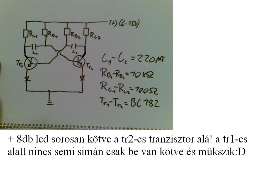 ( köszi a rajzokat megvettem az ellenállásokat meg mindent csak ez már kész volt igy könyebb volt plussz két vezetékkel összekötni) Szal ez megvan és be van kötve rá a 8 led ami villog mint az elakadásjelzö! Van még 10 db ledem köztük 2 db nagy fényerejű fehérrel sorosan kötve, ök folyamatosan világitanának! Szal az lenne a kérdésem hogy mekkora ellenállást tegyek a 10 led elé + ugy szeretném h a szám. gépnek a 12 votlos ágára szeretném rákötni 2 vezetékkel(+,-) ugy hogy a folyamatosan világitó is azon a vezetéken kapja a feszt és a másik 8 led is ami ezzel a tranzisztoros megoldással jött létre!Lényegében aaz lenne a kérdés hogy hogy rakjam igy összességébern végelegesre össze hogy csak már rádugjam a szám. gépre és villogjon a 8 + világitson a másik 10 rem. érteni lehetett hogy mire szerettem volna kijukadni