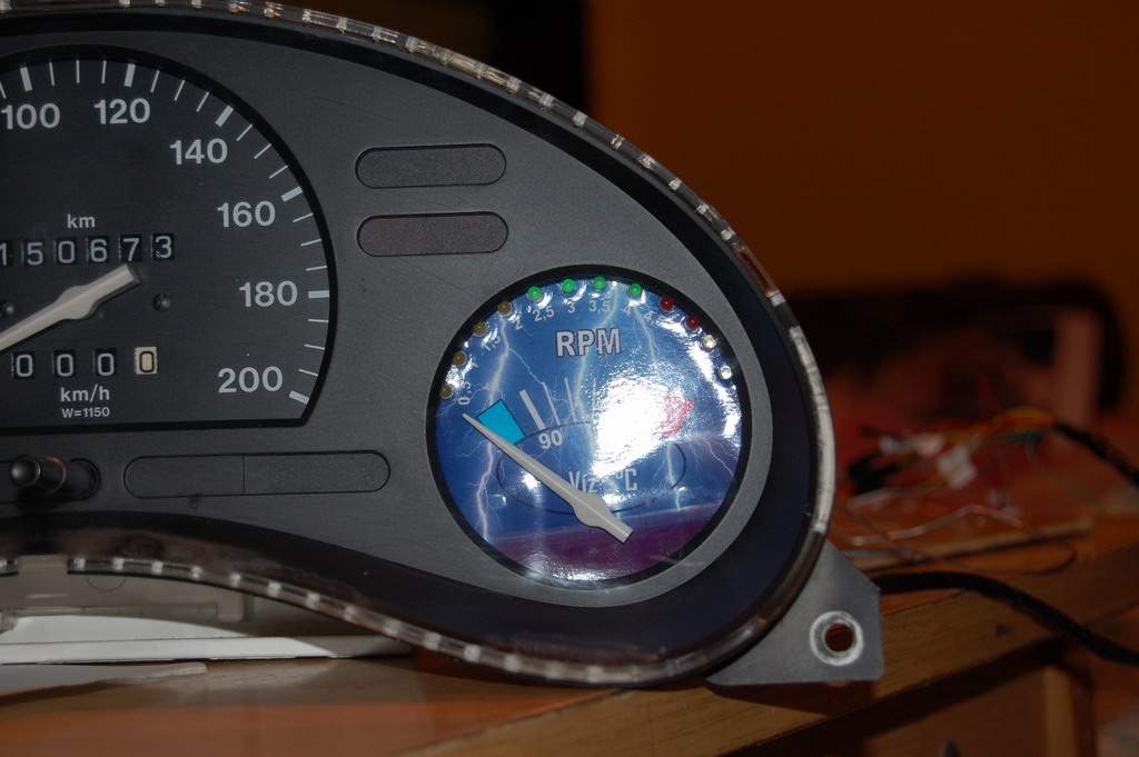 A fordulatszámmérőnél a mutató is és a ledek is mennek egyszerre? Milyen rajz alapján csináltad?