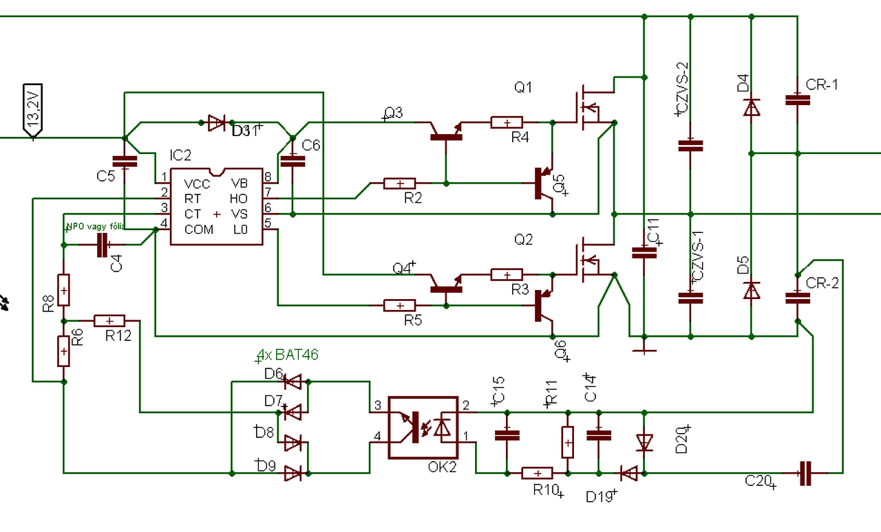 Szerintem ennél többet nem lehet kihozni IR 2153 IC-vel. Rezonáns ZVS, nincs törés a jelalakokban. Most az áramváltós védelmet próbálom, mert A kondenzátoros feszültségosztós öt 555-ös ICs megoldás nem igazán működött bizonytalan volt, hol jó hol nem jó.