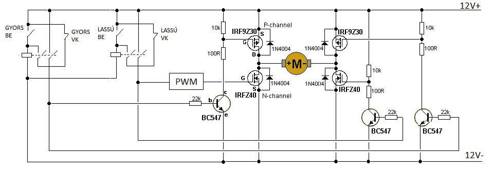 Adott egy feladat, melyben egy 12V-os DC motor (lineáris aktuátor) vezérlését kell megoldani. Egyik irányba (gombnyomásra) a motor teljes fordulaton menjen, míg egy végálláskapcsoló meg nem állítja. A másik irányba (szintén gombnyomásra) csökkentett fordulaton térjen vissza, itt is végálláskapcsoló állítja meg a végén. A fentieknek megfelelően összeraktam egy rajzot. Az indítást-leállítást legegyszerűbben öntartásos relékkel tudtam elképzelni. A fordulatszám csökkentést 555 PWM végzi, a forgásirány váltást egy FET-es H híd. Teljesítményelektronikával nem foglalkoztam, így a FET-es rész neten talált kapcsolásokon alapszik. Kérdésem az lenne, hogy szerintetek az alábbi rajz működhet-e, esetleg min kellene változtatni. Előre is köszönöm!