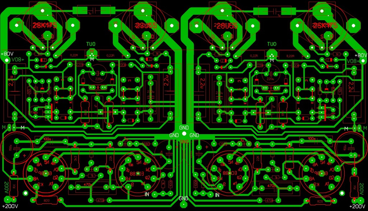 Csak ez a nyákterv van meg, a képen látható egyedi kérésre lett módosítva, plasztik tokozású FET is rákerült, azt a változatot nem mentettem el..