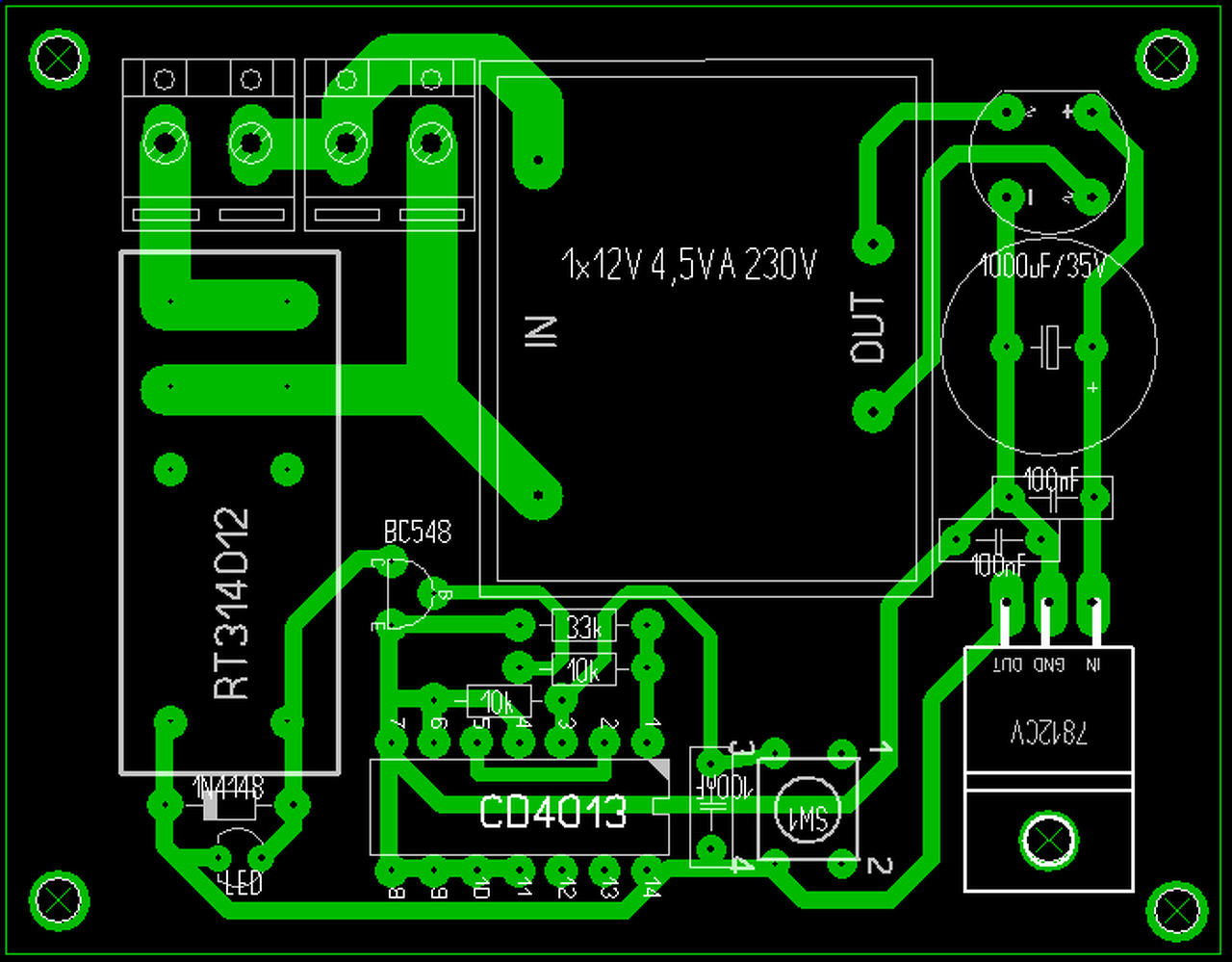 A stab. IC kimenetén lévő 100nF mindkét lába GND -re van kötve, és a LED elé áramkorlátozó ellenállás kell. |