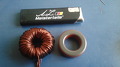 T130-2 porvas. Most 15uH egy rétegben tekerve. Nagyobb sajnos nem volt, ebből tudtam csak 6 db-ot szerezni. Viszont elég az alacsonyabb küszöbfrekvencia is, 30uH-1µF olyan tompán szólt. Most egész szép magas hangokat ad.