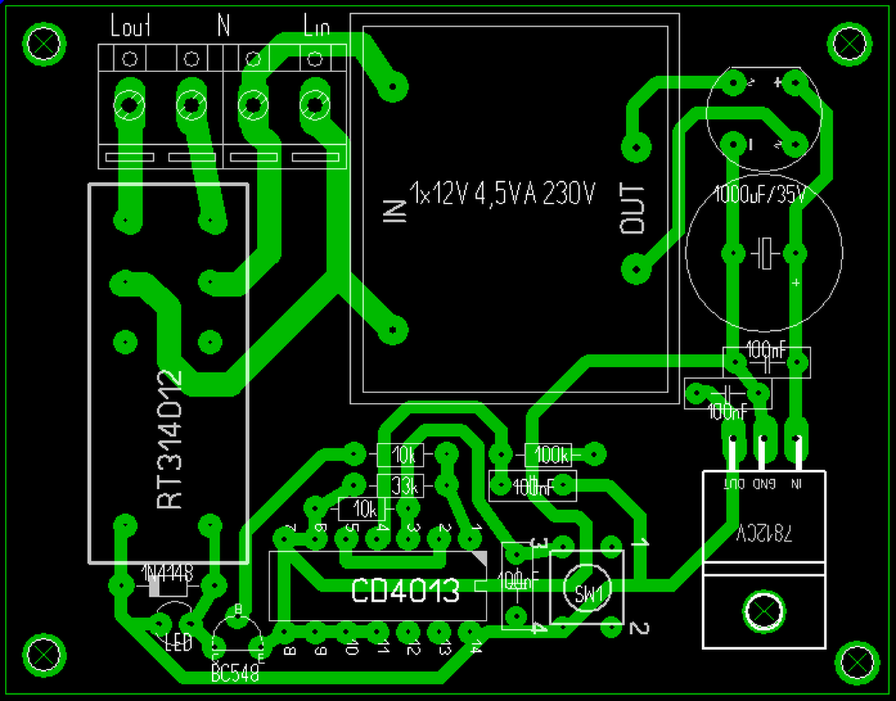 A Trafó belső 230V -os kivezetésének forrszeme és a CD4013 4. lábára menő veszeték között nincs meg az előírt minimális 7.5 mm-es kúszóút (fém mentes távolság). Sajnos az áramkör így életveszélyes.