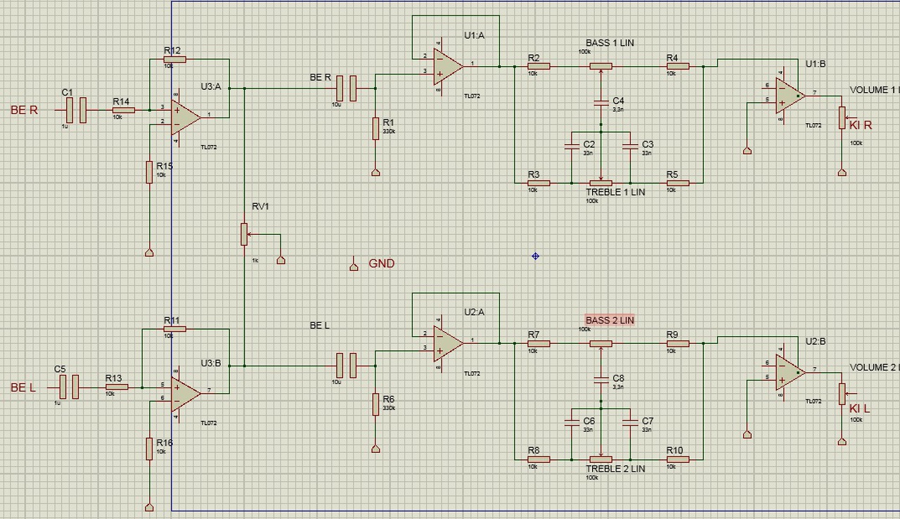 Az áramkört alacsony impedanciáról kell meghajtani, hogy az elvárt kiemelés létrejöjjön, nem bízható a jelforrás véletlenszerű kimeneti ellenállására, ezért kapott még egy műveleti erősítőt. A kedvező impedancia és jel-zaj viszony érdekében helyeztem a balansz szabályzást a műveleti erősítő visszacsatoló ágába. A BSS kapcsolás a kimeneti impedanciát nagyon felületesen kezeli. A bementi csatoló kondi hiánya teszi fel a koronát a műre