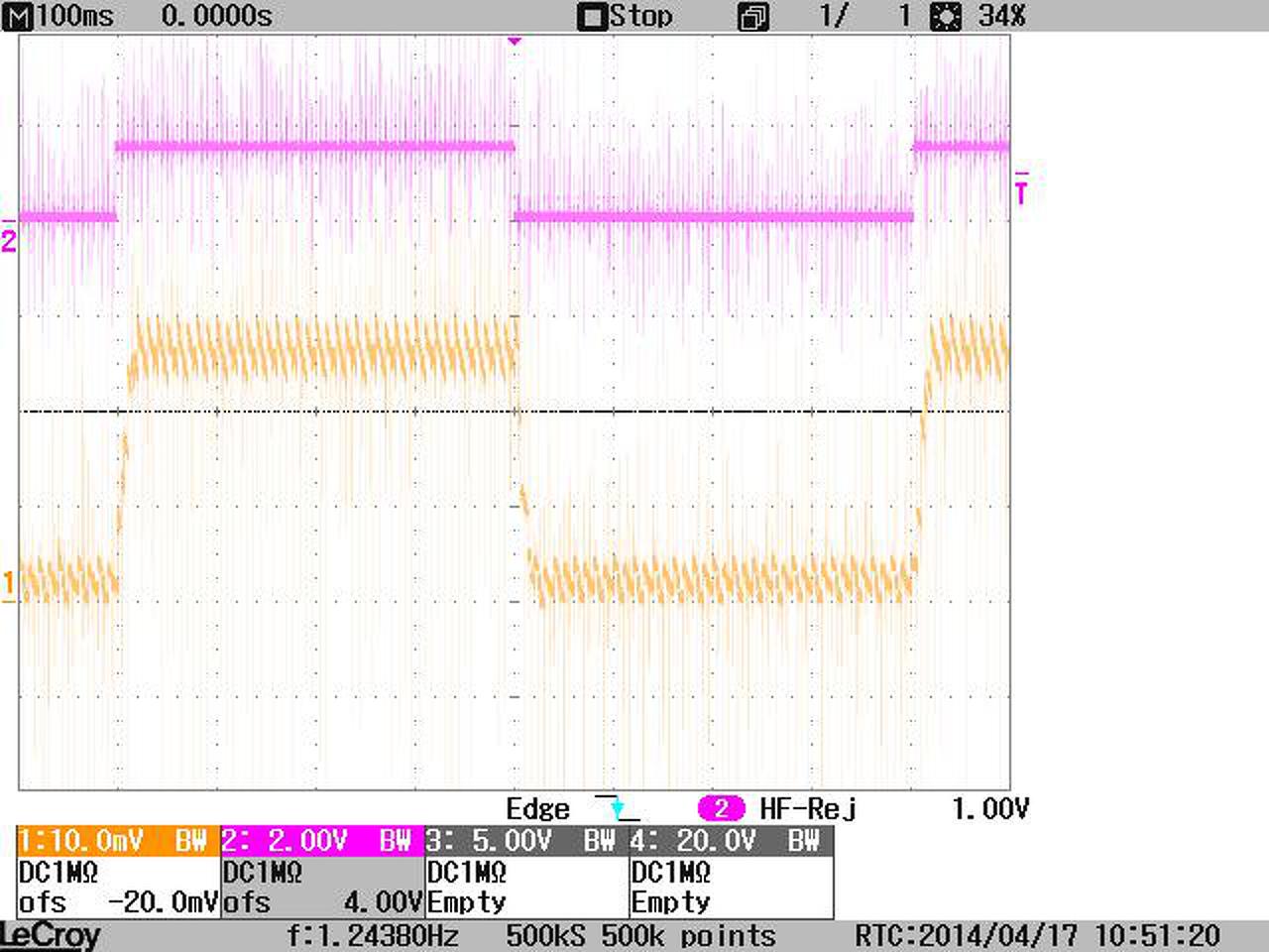 Induktivitás mérés; MOTO0002, sárga a kapocsfesz, lila az áram (100mV/A lakatfogó 2 menettel). Ebből (az indulási meredekségből) L=U*di/dt=20*0,2msec/0,25A=16mH