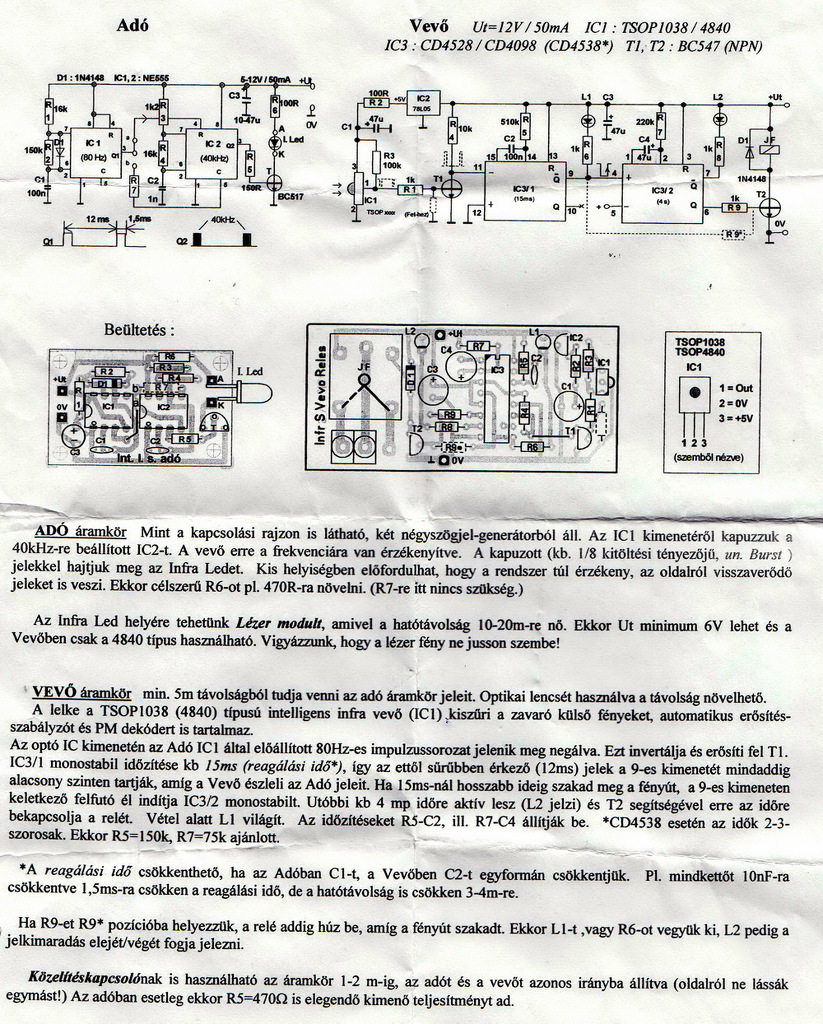 A baj az, hogy még nem vettem meg, egy nagyobb rendelés része lesz, így kipróbálni sem tudom. Olvastam, hogy ezek az 555 kapcsolások csak néhány 10 cm-t tudnak, a hatótávot pedig fókuszálással növelik. Ennél egyszerűbb lenne egy már kész távirányító használata.