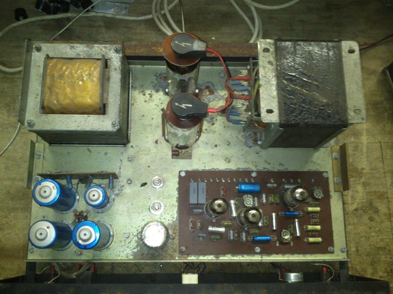 Az alját most nem szedném le ha nem kell.Ott van bent egy egyedileg készített foglalat.A fűtésük a csöveknek sorba van kötve és úgy megy a Puskás trafóra. Az egyenirányító cső ki van kötve belőle , jelenleg csak dísz.Hallgattam gyári érintetlen APX 100-at és szerintem ennek sokkal jobb hangja van.És megvan a gyári gépkönyve is