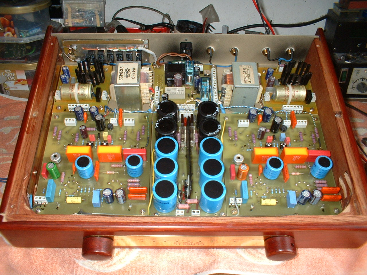 Szerintem nem csunya cső , sapka eltávolítása sokat dob rajta . Nagyon strapabíró , jó hangú , érdemes vele próbálkozni . Előkerestem képet az említett erősítőről , csak élég sötét , de azért valami látszik . Ez fa és sárgaréz kombinációjú dobozba került , az előlap feliratozását egyszerűen +20 lakkal csinálom , mint a nyákokat. Nyáktervezővel megtervezett feliratokat ráfotozom , majd előhívás után ráégetem , így lemoshatatlan tartós felületet ad .