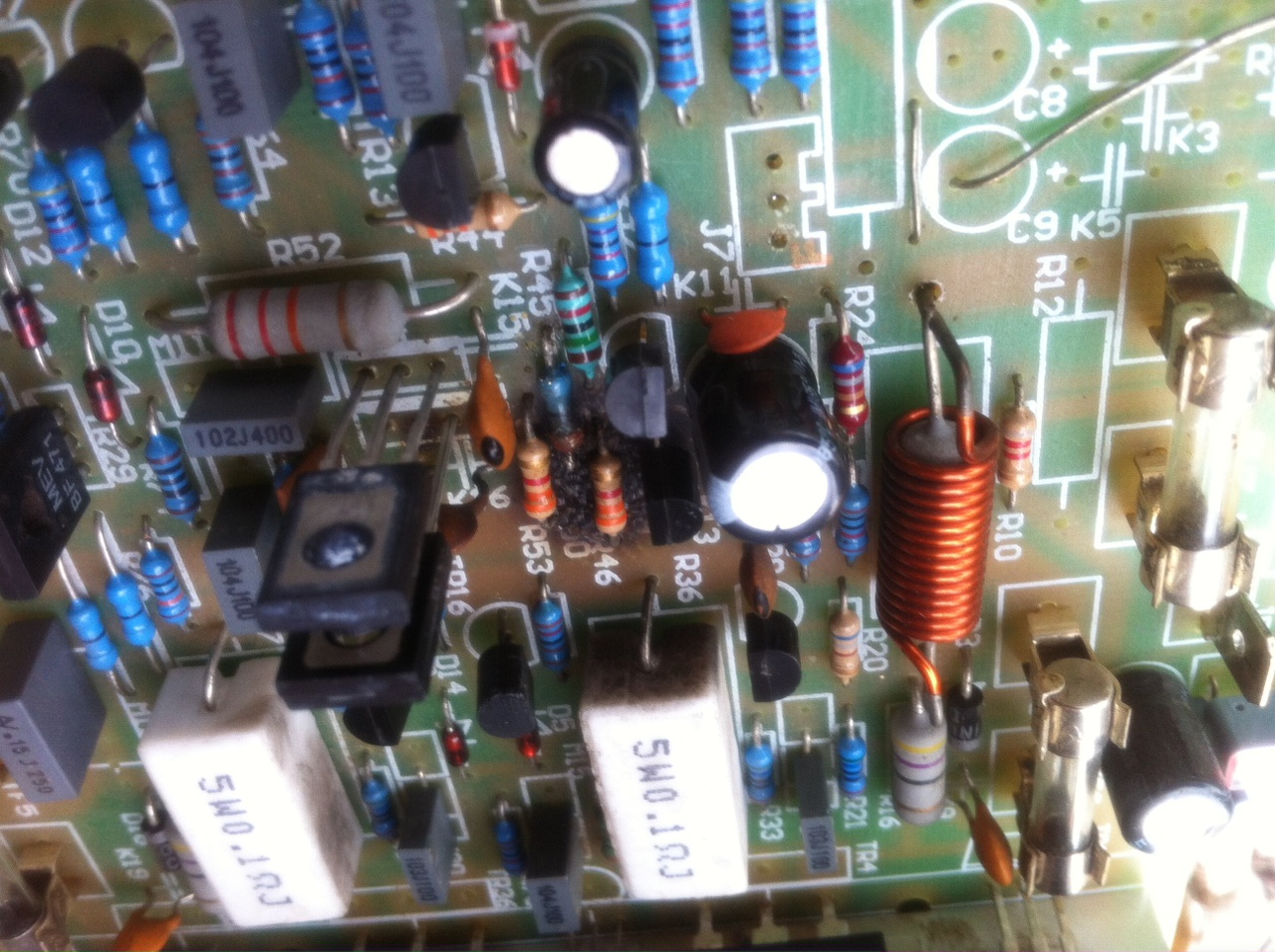 Sziasztok egy kis segítség kellene. Valaki javított már ilyen csodát? Egyik fele szól a másik csendben van 2 tranzisztort cseréltem benne a képen látszik egy kis égés nyom de alul minden rendben. Minden félvezető jó benne és nagyjából egyforma értékeket mérek a jó oldalhoz képest, viszont nincs benne védelem csak biztosíték a kimenetnél viszont protect led van rajta.