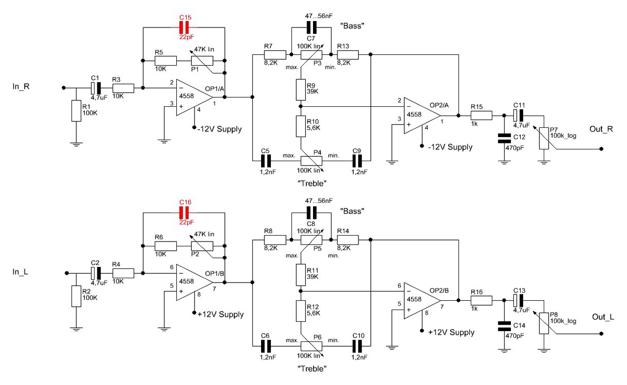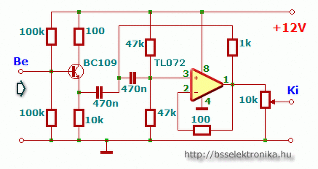Az áramkört alacsony impedanciáról kell meghajtani, hogy az elvárt kiemelés létrejöjjön, nem bízható a jelforrás véletlenszerű kimeneti ellenállására, ezért kapott még egy műveleti erősítőt.
