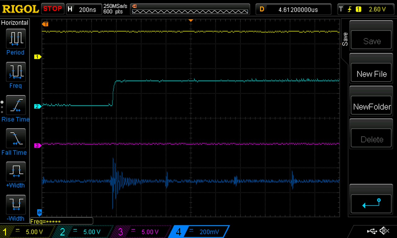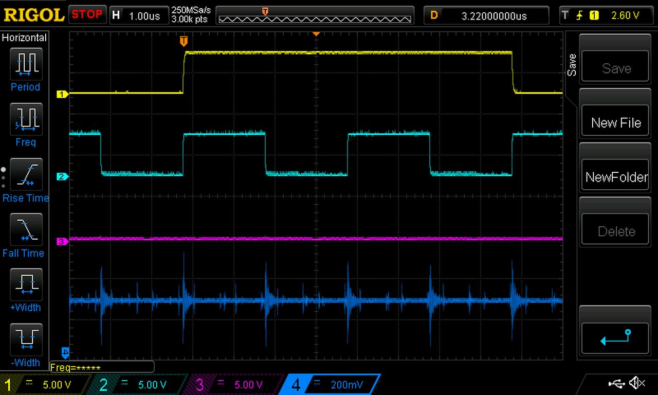 Csatolok még pár képet: Látható, hogy a legnagyobb zavar tranzienseket az SPI órajel élei okozzák és az ADUM1401 izolátorok között lévő kondenzátor melegpontja és a digitális földhöz képest mértem, amihez a táprésznél csatlakoztam. A digitális táp ELKO-ján mérve valamivel mérsékeltebb a zavar, valószínűleg az izolátorokhoz vezető vezetősáv induktivitás és a többi szűrőkondenzátor csillapító hatása miatt.