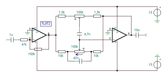 Ha érdekel akkor visszalapozol a hangszínszabályozós topikban, és megkeresed azt a rajzot amit hónapokkal (talán évekkel) ezelőtt feltettem. Szimulátorban tököltem ki az értékeket hogy jó legyen, és emeljen rendesen úgy a mély mint a magas, illetve akár beállítható erősítésű legyen az illesztő fokozat, egyrészt azért ha olyan a végfok erősítése hogy ezt még pluszban megkívánja, másrészt azért hogy egy egyszerű, potikból álló passzív keverőt is elé lehessen tenni, ha éppen valakinek hangszínszabályozós keverőerősítőt építeni támad kedve. A gyakorlatban is remekül bevált, ma már minden végfok elé kizárólag olyat teszek. Zajt csak akkor hallok ha odahajolok a hangszóró elé, de akkor sem az erősítő zaját hanem a hangkártyáét.
