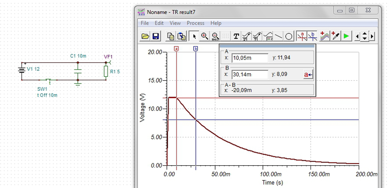 Ohmos terhelésre így néz ki a dolog. A kondi fel van töltve, majd 10ms után le van kapcsolva róla a 12V feszültség, és kisüti az 5ohm. A képen látható a folyamat, leolvashatóak az értékek. 20ms elteltével 8V van a kondiban.