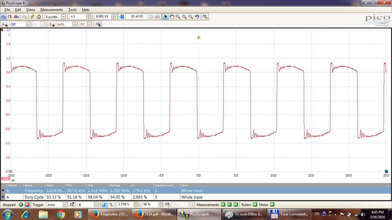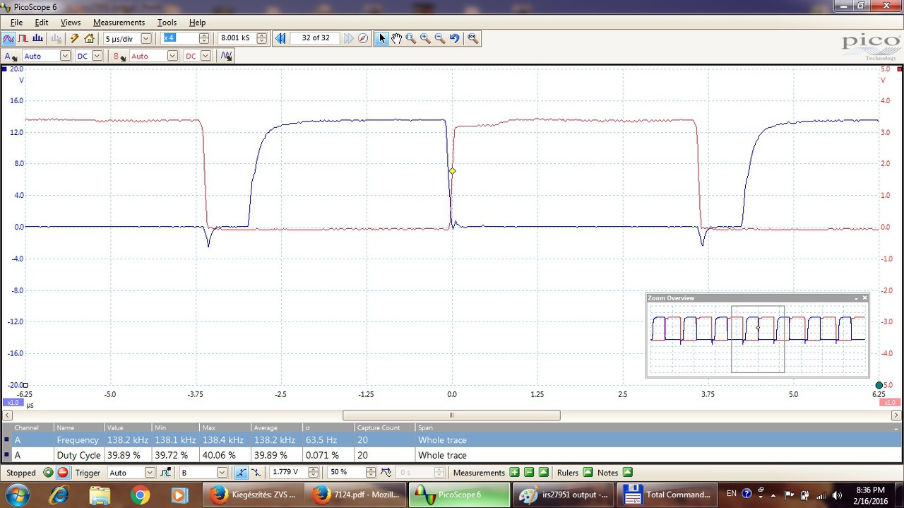 Ujra szeretném kérdezni, remélve, hogy ezuttal választ is kapok. Rezonáns tápot építettem IRS27951 + IR2110 el. Működik is, csak az a bajom vele, hogy melegszik, szerintem töbet a kelletnél és üresjáratban is melegednek az IGBTk. Megmértem lakatfogóval és üresjáratban 0,05A fogyasztott a 230V-os hálózatról, azaz 11W-ot. Üresjáratban az IGBT-k 5 perc alatt elérik a 70 Celsius fokot. Növeltem a holt időt 230 nS -ról 630 nS ig és semmi változás nem történt ami a hőmérsékletet illeti.
