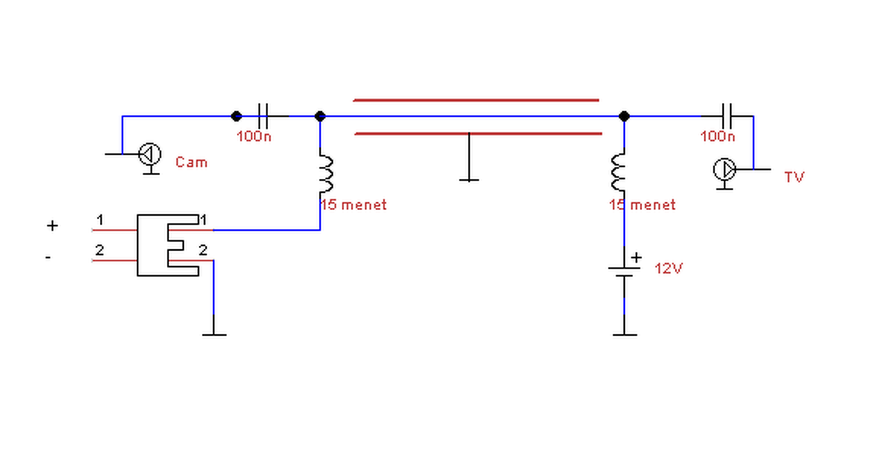 1 lépésként készítesz 2db fojtót , méghozzá 2-3 mm-es anyagra pl csavarhúzóra 15-20 menet(et) tekersz 0.4 - 0.6 CuZ drótból . Persze ez légmagos . 2. lépés : kamerától ---> +12 Volt csatira egyik fojtó ----> sorosan a koax meleg ér ( közepe ) + idejön a pl 100nF egyik fele a másik fele a kamera videó csati közepére . 3. lépés : TV fele , koax közepe + a 2. 100 nF kondi egyik fele a másik fele scart ( RCA középső lábra , BNC ,stb ) és még a koax közepéhez megy a 2. fojtó egyik fele másik fele a tápegység +12 Voltjára . A 12 Volt - mínusza koax harisnyán keresztül a kamerához -12Volt és RCA csati árnyékolására . Néztem a linket , vegyél a lengő dúgajnak párt és a videónak is . Holnap inkább lerajzolom . Dugasztáppal vigyázni a 12 Voltos akár lehet valóságban 15-20 Volt is Üdv