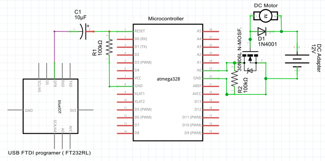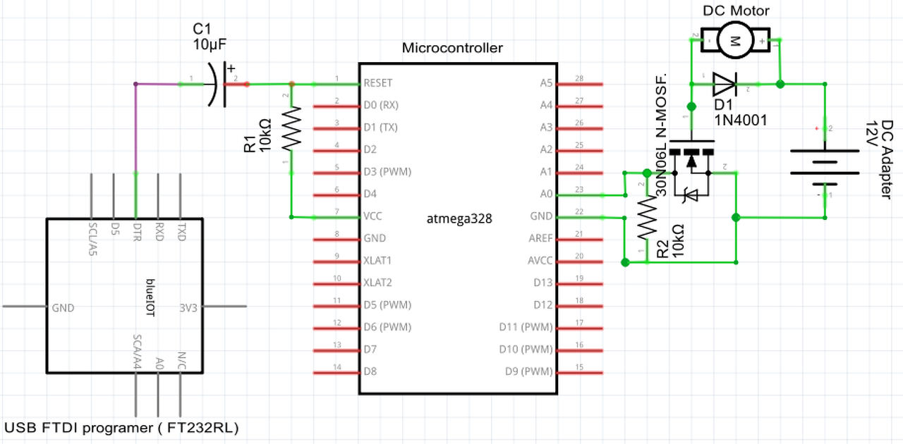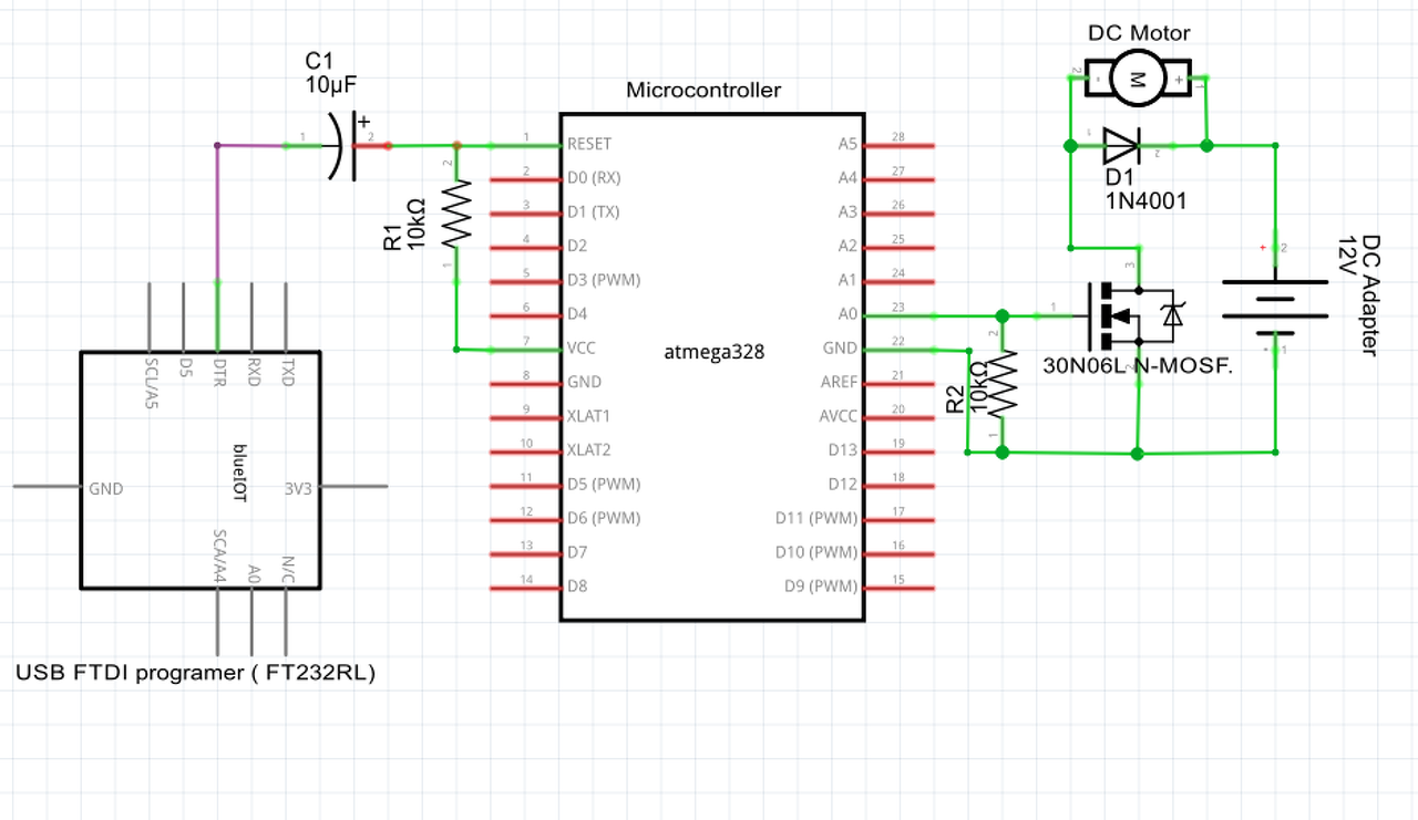 a segítségetek szeretném kérni a következő áramkörrel kapcsolatban. Egy mikrokontroller egy Power MOSFET-en keresztül kapcsolgat egy DC motort. A MOSFET vezérlő lábaira 0 vagy 5V-ot kap, ennek megfelelően kapcsolja ki-be a 12V-os áramkört. A probléma az, hogy a MOSFET nem 0 vagy 12V-ot kapcsol, hanem ~2 és 12V-ot. Mivel a 2V nem elég, hogy megforgassa a motort így a MOSFET durván melegszik (bár ebben az állapotban nem is kellene, hogy forogjon a motor). Ha viszont a mikrokontroller RESET lába rá van kötve az FTDI adatper DTR lábára, akkor 0 és 12V-ot kapcsol a MOSFET, vagyis ekkor jól működik. Az FTDI adapteren keresztül programozom a mikrokontrollert (természetese ekkor a TX, RX, GND, DTR lábak is be vannak kötve). Miért viselkedik máshogy az FTDI adapterrel? A hozzászólás módosítva: Feb 29, 2016