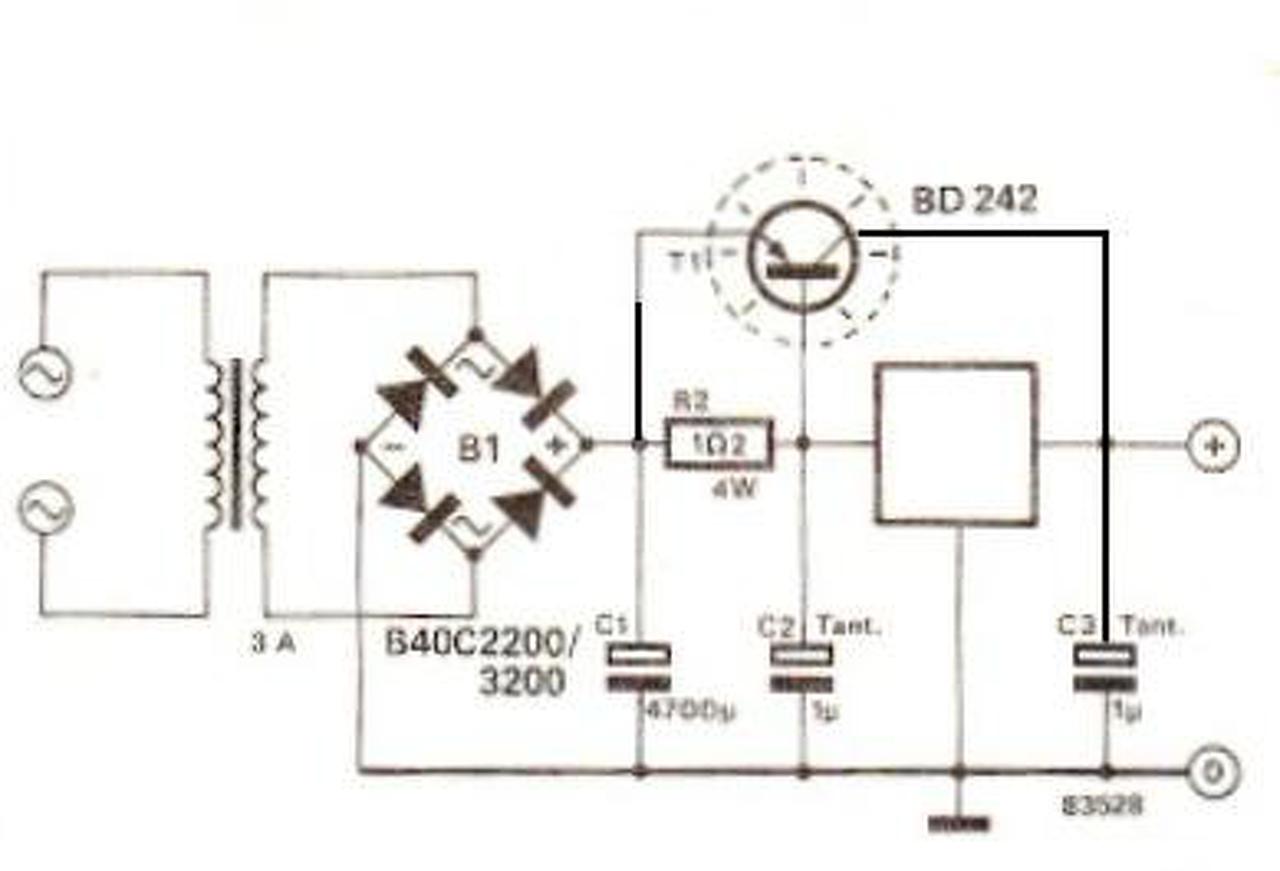 R1 jobb lenne 22 Ohm. Több áram marad a stabilizátoron átfolyóból a bázis felé. A BD246, ami a BSS rajzon szerepel, megfelelő, de ezeknek a nagyáramú tranzisztoroknak kicsi az áramerősítésük, nem árt, ha van bőven bázisáram. R2 jó, ahogy van. Az emitter elé mindenképpen kell pufferkondi. Oda kell a 10000 uF. A 7812-es 1-es lábára elég 100 uF.
