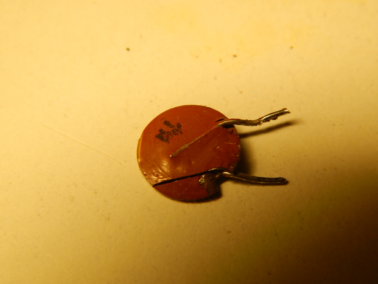 Ugyanott egy narancssárga kör alakú kondi is el van törve, annak sajnos nem tudom az értékét.