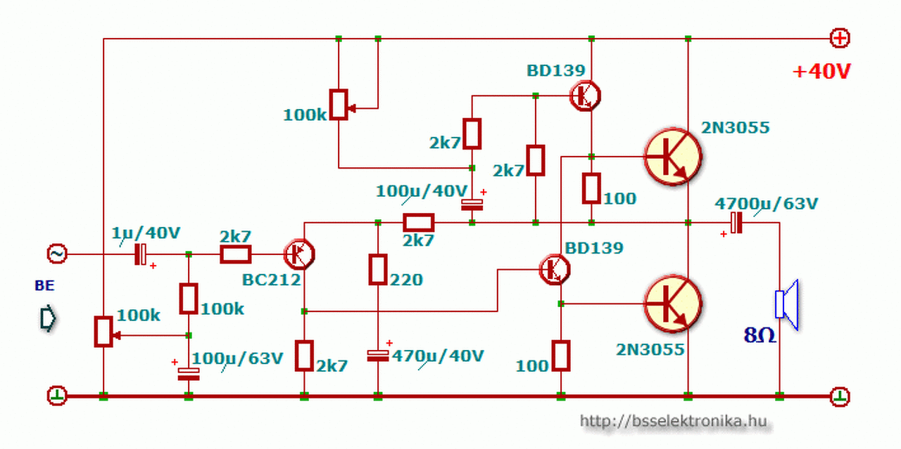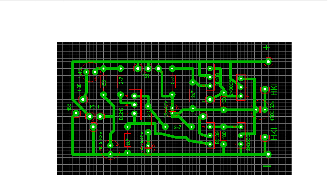 Lenne pár észrevételem, ami szembetűnő, a bc182 nem ez a tranzisztor, ahogy a 2n3055 sem, a kimenetet meg a kicsatoló kondit nem tudod a tranzisztor után tenni, mivel a hosszanti elrendezés miatt oda fog kerülni a borda, de nem is muszály mögé tenni, teheted elé is.A bd139hez a sávot kicsit rendesebben próbáldd meg azért