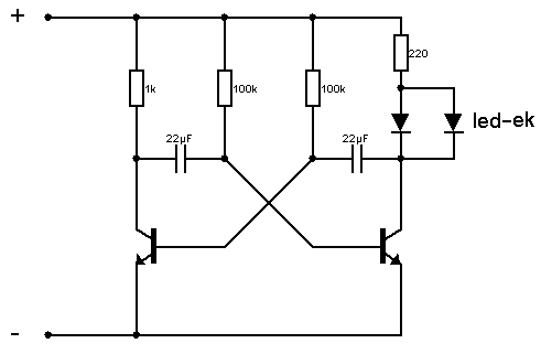 Persze ahogy kapcsolgatod villog (csak ráérőknek) Legegyszerűbb szerintem is a villogó led (ha kettőt akarsz akkor sorbakötsz egy villogót meg egy simát ) soros ellenállással (esetleg egy pár mikros kondival a ledekkel párhuzamosan) 9V elemről három led is elvillog (tovább nem mertem emelni a tápot).