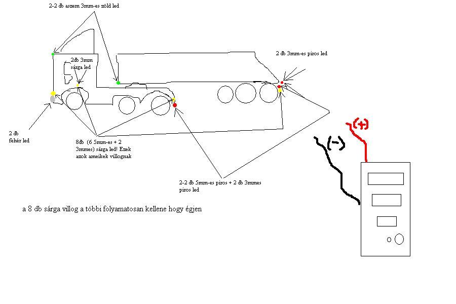 értem! Hát akkor gondolkoznom kell vmi jo megoldásba! Mert ez amugy egy ien kamion modell lenne, van rajta 6 db 5 mm-es sárga + 2 a kissebb méretű sárga led ezek lennének a villogóak amire épitettem ezt a kapcsolást! Van még helyzetjelzőnek a kisebbik fajta ledekböl 4 db zöld + 2 db piros, 4 db 5 mm-es piros , és elöre van még világitásnak az a 2 db 5mm-es nagy fényerejü fehér led( 3 voltot mondtak a boltban nyitónak) ezt szerintetek akkor mondjatok vmi jo megoldást hogyan kivitelezzem hogy mindez müködjön a szám. gépröl bocs a képért csak gondoltam igy el tudjátok épzelni h hogy is kellene