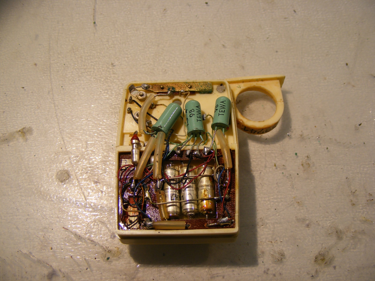 Ez egy korabeli hallókészülék. 2 gombakkuval működött. Kéteres sodrott vezetékkel ment az egyik fülhöz, egy kis 'agybadugóval'.