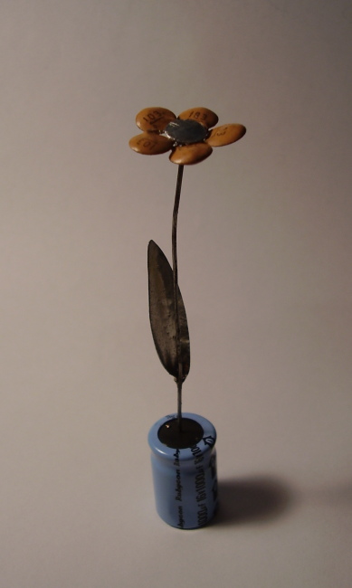Nem bírtam magammal és én is csináltam egy virágot. Annyival turbóztam fel, hogy cserépbe (potmétergomb) tettem, és ahogy azt a nagy cserepesvirágoknál is szokták, vékony fonalat (vékony zománcozott Cu huzal) gyűrtem bele díszítésnek. Jah és én a leveleket 4,5 V-os elem érintkezőiből csináltam. De ennél is egy elkó az alja, ami be van dugva a potigombba, szóval locsolni szigorúan elektrolittel szabad!!! :yes: Peti. Szerk.: a képeket mindig elfelejtem