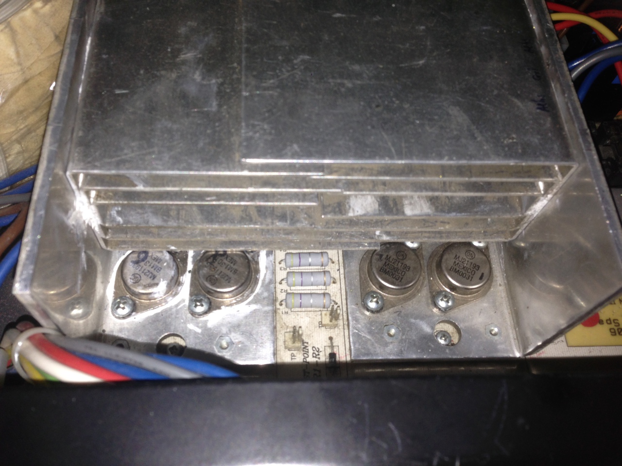 A végtranzisztorok kollektorjai közvetlen kapcsolatba vannak a hûtôlemezzel, a hûtôlemezen GND van, rá van fogatva a nyákra, és nem érintkezik az alvázzal. Az annó hibás csatorna nagyobb feszültséget kap, ( a gyári 2x69v ac terheletlenul, a külsejére 2x66.6V ac van írva, a belepiszkált pedig 2x75,3ac terheletlenûl) a trafóba bele volt piszkálva, soha nem bontottam szét, így vettem.