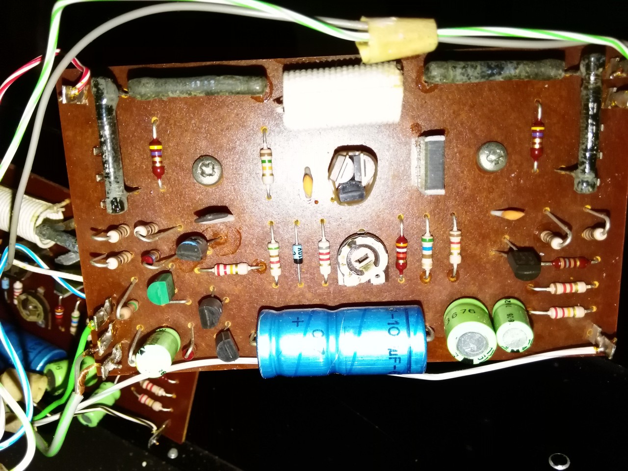 ) végfokozat hibás, de külsőleg nagyon megkímélt példány...A bal oldali '+' '-' biztosítékok szakadtak voltak, gondoltam lássuk mitől mentek ki, másik 1,6A-es páros be, erősítőt 100W-s izzóval sorba bekapcsol, az izzó is világított meg a biztosítékok is... Na akkor mérjünk!A nagy teljesítmény tranzisztorok jónak tűntek, de a hibás oldal TIP3055 tranzisztornál kisebb Ohm értéket mértem, mint a jó oldalban lévőnél, tovább a meghajtó tranzisztor felé, amiről itt a fórumon is írták, hogy eléggé alul van méretezve (BFR80), na ott egy szép kis C-E zárlat...Cseréltem BC640-re és minden oké lett! Akkorát szól, mint az állat! A hangszín potenciométerek voltak még kissé recsegősek, azokat megkínáltam kontakt tisztító-kenő spray-vel és így már minden tökéletes lett! Sajnos vissza kell adnom a gazdájának, de tényleg egy korrektül összerakott, mutatós kis erősítő.Egy dolog amit még kiszúrtam és egy kicsit borzolja a lelkivilágomat: a 2x10000/35V mikrós pufferek, amiken meg +-33V 'virít' terheletlenül...hát ez is jól ki van centizve.