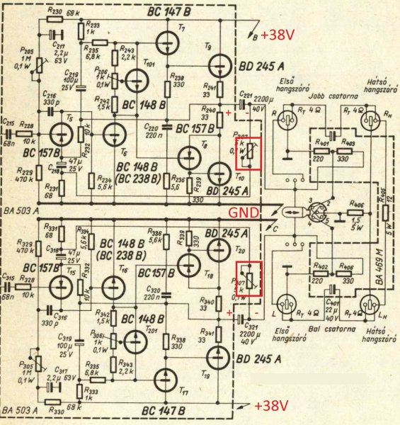 üdv. kicseréltem a trimmereket. semmi javulás. sőt kissé zajosabb is lett, miután a p 205-305 (kimeneti egyen fesz.... trimmereket kicseréltem. ezeken ha állítok valamelyest csökken a sustorgás, de ez esetben a hangminőség lesz recsegős. egyébként ha vissza van állítva minden, akkor jóval erőteljesebb a hangzás mint a trimmerek cseréje előtt volt. csak a sustorgás.... az ellenállásokat is ki szeretném cserélni mert már máshol nem lehet gond.... itt gondban vagyok mert a pontos értékeket nem tudom.