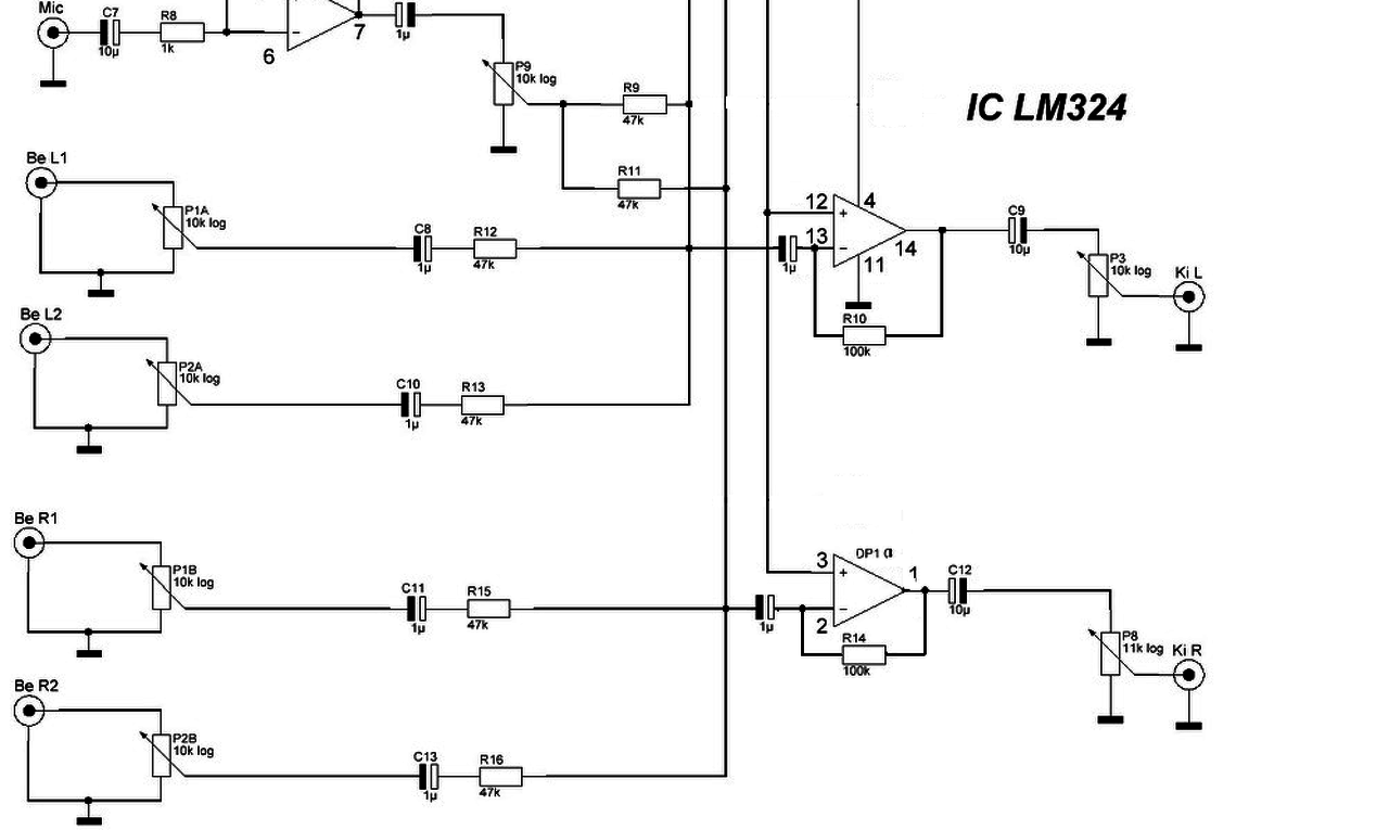 Sziasztok. Megépítettem a képen látható keverőt. Sajnos nem működik. Megmértem az IC lábain a feszültségeket a 11-es negatív lábhoz képest. Semmi nincs rádugva csak a táp. Ha valaki megnézné, hátha neki mondanak valamit a feszértékek, és lát benne hibát. 1-11, 2-2,071, 3-6,14, 4-12.27, 5-6,14, 6-6,14, 7- 6,14, 8-6,14, 9-6,14, 10-6,14, 12-6,14, 13-2,079, 14-11. A mikrofon bemeneteket nem próbáltam, csak a vonali bemeneteket.