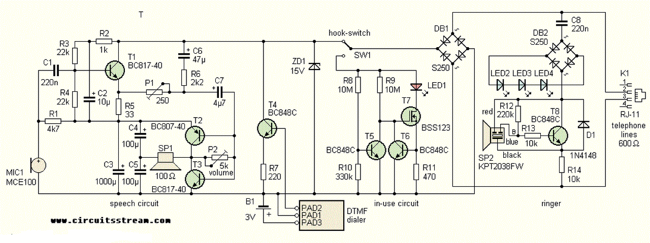 Van egy rajzom, ami elvileg egy komplett telefon. Akár megépíthetném ezt is, erről menne a headset (trafó nélkül van megoldva az önhang kioltás), van hangerő állítási lehetőség is. Egy sima NPN tranzisztor egy emitterellenállással csatolja be a DTMF kódot, Ha meghagyom a tranzisztort és azt vezérlem a kis trafóval a PC-ről, akkor a PC is mindenképpen védve van a visszahatástól, bár ott van a 15V-os zener is. Gyakorlatilag 4 tranzisztor és egy kapcsoló. Bekötöm a telefonjuk elé. Híváskor az csörög, ha akarja felveszi a telefonkagylót, ha akarja benyomja a kapcsolót és beszél a headseten. Híváskor bekapcsolja és entert üt a PC-n, aztán vagy közben fel is veheti a kagylót, vagy beszél a headseten.