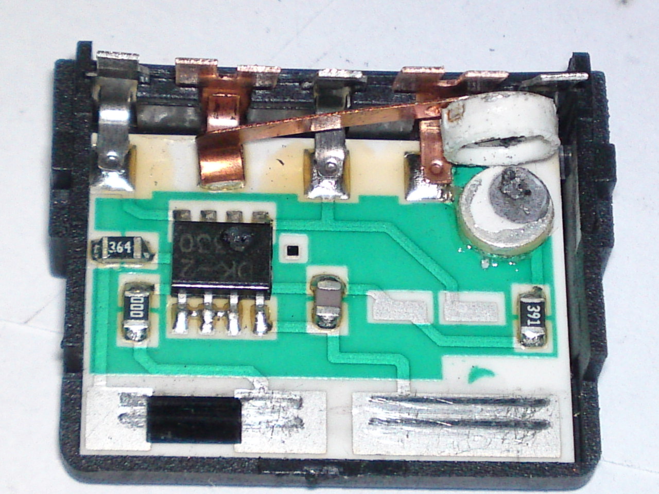 Szerintem a schottky ment először tönkre (az akkupakk nem lett véletlenül fordítva berakva?) és akkor már nem volt ami a többi félvezetőt megvédje. Az ic a potival állítható kitöltési tényezőjű négyszög jellel kapcsolja ki/be a motort egy feten keresztül. Egy 555-is IC-vel épített áramkör is kiválthatja. Ahogy Kovidivi is javasolja rajzold vissza az áramkört, úgy még az is kiderülhet, hogy valami ismerős ic van ott, csak álruhában. Ez működik. Kicsit kezdünk itt offok lenni.