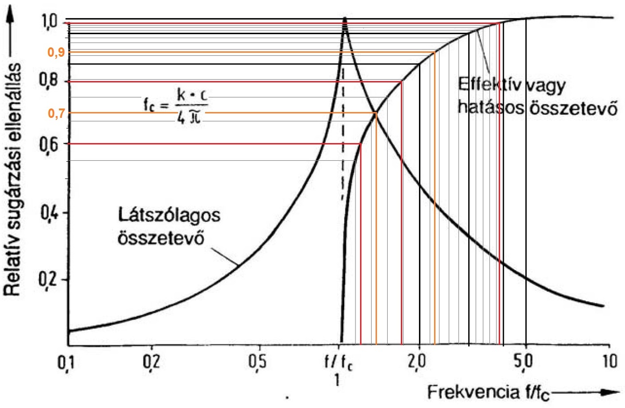 Ezt az alábbi kép alapján határoztam meg, így fc/f=2 esetén, tehát 30Hz-nél már 85% a sugárzási ellenállás effektív összetevője.