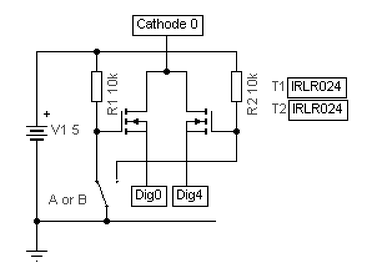 Mivel minden szegmens ugyan arra a meghajtóra van kapcsolva, és a D0-D8 katódokat multiplexálja a vezérlő, így a katód vezérlőt kell a megfelelő digitre irányítani. Vagy is a a D0-D4, D1-D5, D2-D6, D3-D7 között kell átváltani. Pld. megoldható, ha négy ilyen fokozatot építesz meg. A kapcsoló kiválasztja, hogy az "A" számot vagy a "B" számot jelenítse meg a kijelző. (Kapcsolóból, és felhúzó ellenállásból csak egy-egy kell, mind a négy Gate mehet egy kapcsolóra.)