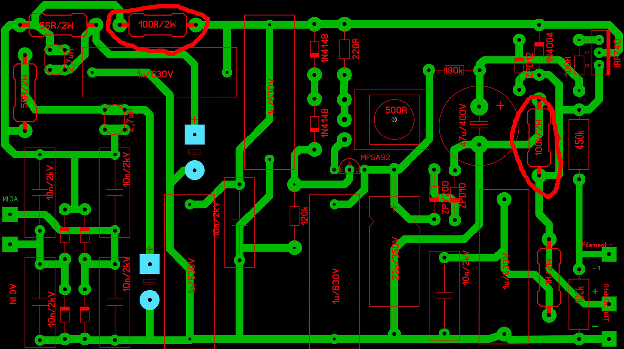 Hello Scooby mester! Elkészülte a stab tápok. Még egyszer köszi. A fűtés része szépen muzsikál, de az anódfesszel gondok vannak. Kicsit átalakítottam, mert egyfelől nem kellett a 70V-os kimenet, ezért azt kivettem, másfelől betettem a végére egy osztót a fűtés felhúzásához. A szűrőkondenzátorok nagyobbak 330u/400V. Ezt most egy CD csövesítéséhez csináltam, ahol 180V-ra van szükség, ezért a zenereket is kicseréltem. A NYÁK-ot is kénytelen voltam áttervezni, mert egyfelől a meglévő alkatrészek méretei eltértek, másfelől pedig kevés a hely a CD lejátszóban. Kb. 210V váltófeszültséggel meghajtva a bekapcsolás után nagy szűrőkondik feszültsége felmegy, majd elkezd zuhanni. A 100ohmos ellenállások pedig felizzanak, különösen az első. (Pirossal jelöltem.) Eközben a kimeneten ezzel együtemben nő a feszültség, 40V-s kimenetnél az első 100ohmos ellenállás már izzik. Persze nem vártam meg, amíg elég, hanem lekapcsoltam. Van esetleg ötleted, hogy mit rontottam el. A módosított NYÁK-ot mellékeltem, pirossal jelölve a melegedő elllenállásokat.