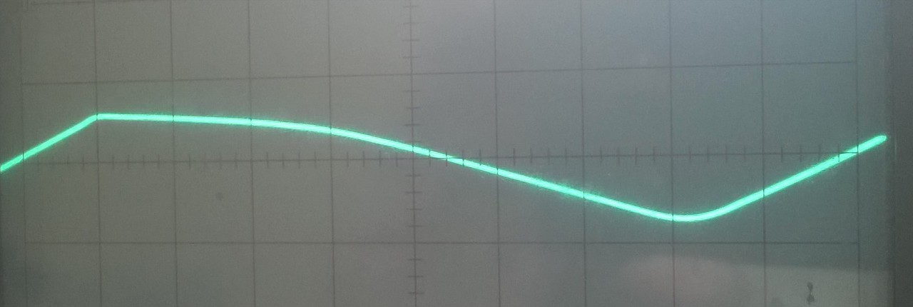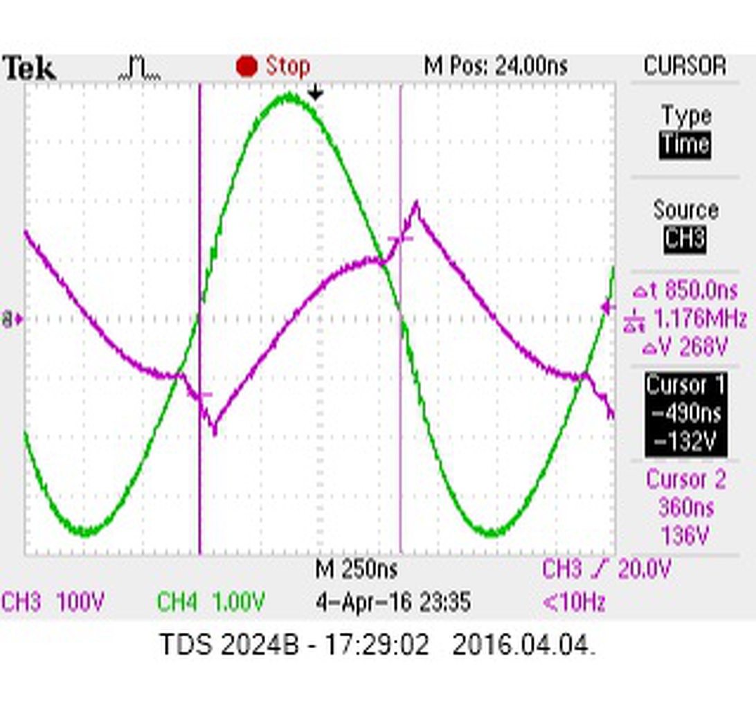Ez az egyik kísérleti légmagos tekercs fesz és áram jelalakja, a probe-ok izoláltak.