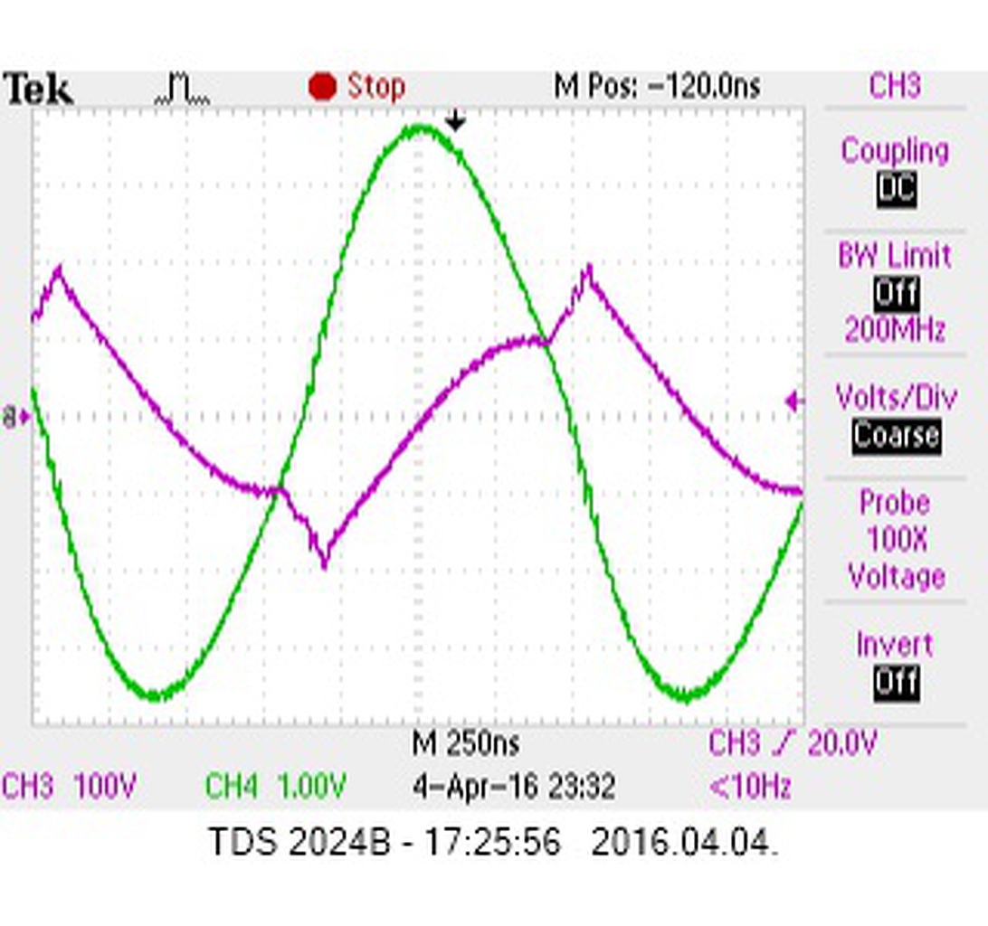 Ez az egyik kísérleti légmagos tekercs fesz és áram jelalakja, a probe-ok izoláltak.