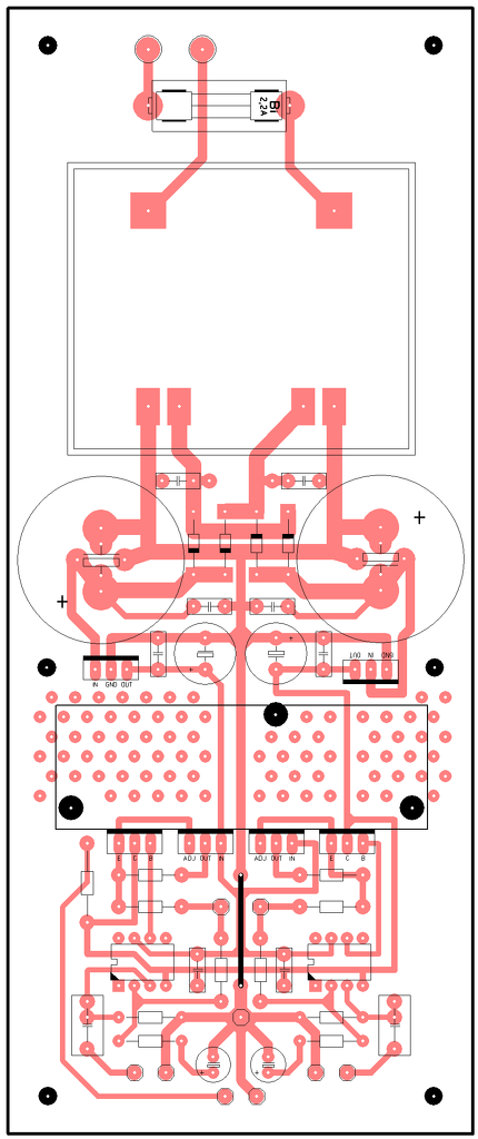 Majd kijavítanak ha tévedek, de ugyan nem nagyon látszik a trafód bekötése, de szerintem így nem nagyon jó. A középső két kivezetést kell általában összekötni, és a két szélső szokott lenni a trafó két különálló tekercse. Én úgy csinálnám, hogy megmérném....méghozzá erősítő nélkül, hogy milyen feszültségeket kaptál a kábelek végén.