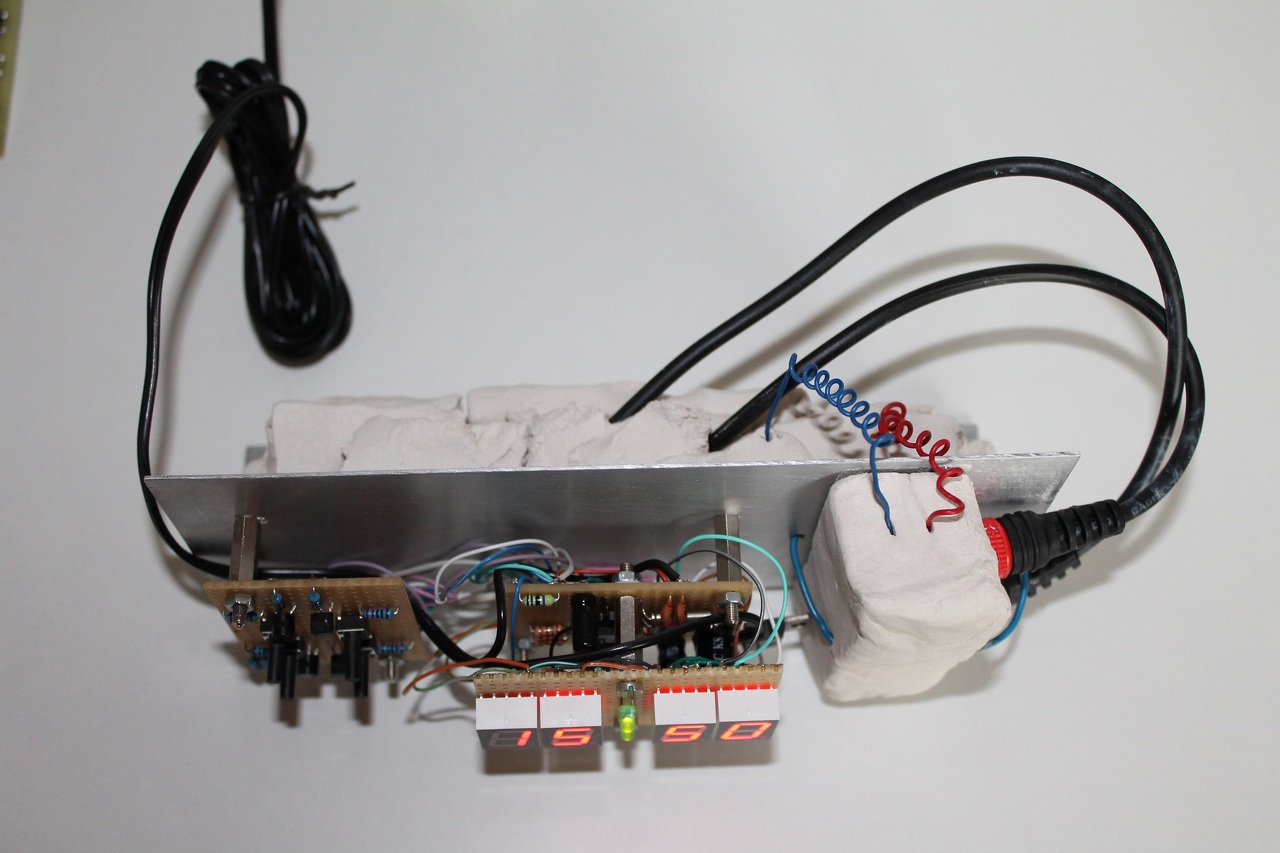 Mostanában sem tétlenkedtem - igaz, néha sportolok, dolgozgatok, angolt tanulok vagy éppen lélekben sörözök Hraballal és társaival egy-egy kellemes könyvön keresztül. Újabb órával jelentkezem, Rumcájsz cikke nyomán! Ami köztudott, eléggé elcsépelt téma már ez a bomba-óra, nekem is a második verzióm készült el. A munka során arra törekedtem, hogy ne a mindenki által megszokott dinamit stílussal hozakodjak elő, hanem valami egyedibbel. Így történt meg, hogy a világhálón kutakodtam, meg a sok éven keresztül tartó Counter-Strike mániámnak hatására egy C4 plasztik bombát koppintottam most le. Nos, a múltkor már beszámoltam arról, hogy húsvétra nem tudott elkészülni mind a két betervezett időmérőm, csak az egyik, a sünis. Jelentem: pótoltam a hiányosságokat. Hát mit ne mondjak, most is sokat tanultam, sorolom: -nem szabad vakon megbízni senkiben a fórumon. Nyilván nem direkt lettem félrevezetve az első nekifutás alkalmával, amikor egy másik kapcsolás kudarcba fulladt. (ez van) -az utóbbi időben nagyon sokat építek ilyen lyukacsos panelon. Egyrészt azért, mert lusta vagyok órák hosszát szenvedni a maratással, stb, másrészt arra a megállapításra jutottam, hogy így sokkal többet tanulok. Ilyenkor nem csak az van, hogy egy adott panelt beültetek és jobbik esetben örülök, hanem saját magam drótozok, a kapcsolás végig előttem van, tudok gondolkodni, és hosszasabban értelmezni dolgokat. Amikor meg elrontok egyet s mást, akkor jövök ide segítségért, adatlapozunk, és egy csomó minden megmarad bennem a későbbiekre is. -Így is lehet gusztusos munkákat készíteni, nem csak a hiperszuper maratott nyákokkal. (nyilván itt most a vezetkézesnél épp nem ez volt a lényeg )Várom ám továbbra is az építő-romboló jellegű kritikát, minden vélemény számít! A "töltet" az édesanya kézimunka felszereléséből lopott gyurma (gondolom örül neki). Fél kilót elhasználtam. Kb. tíz deka ment töltetnek, a többi hátul csücsül súlyként, hogy a kóceráj ne essen hasra. Egy régi erősítőm dobozát vágtam szét a tartószerkezethez. Nem lennek kukac, ha meglennék elégedve magammal, így most sem minden tetszik. Ezt kell majd szeretnie a jövendőbeli gazdijának. (elnézést a kisregényért) Üdv!