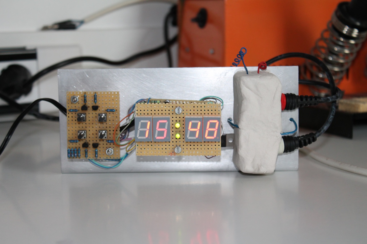 Nemrég elkészült a VFD órám. Az elektronikája nem túl bonyolult, CMOS számlálókból és kapukból épül fel. Áramszünet esetére kapott még egy CR2032-es elemet, hogy ne kelljen újra beállítani.