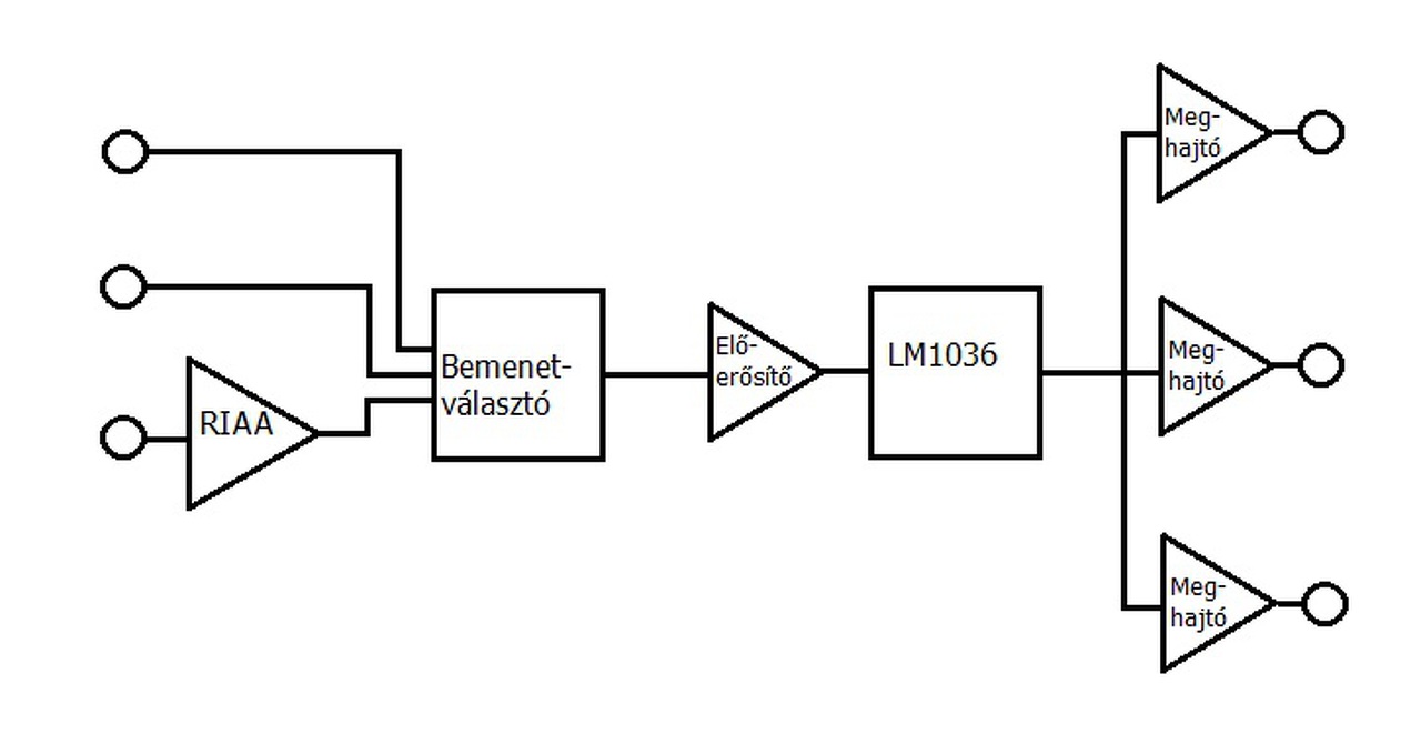 Először készíts egy blokk-diagramot, mely ábrázolja az elgondolásod szerinti egységeket! Ha LM1036 fogja a hangszínt és a fő hangerőt szabályozni, akkor előtte a különböző bemeneteket azonos nívóra kell hoznod, mert alacsony jelnél a zaj, magasnál a torzítás lesz kellemetlenül nagy mértékű.