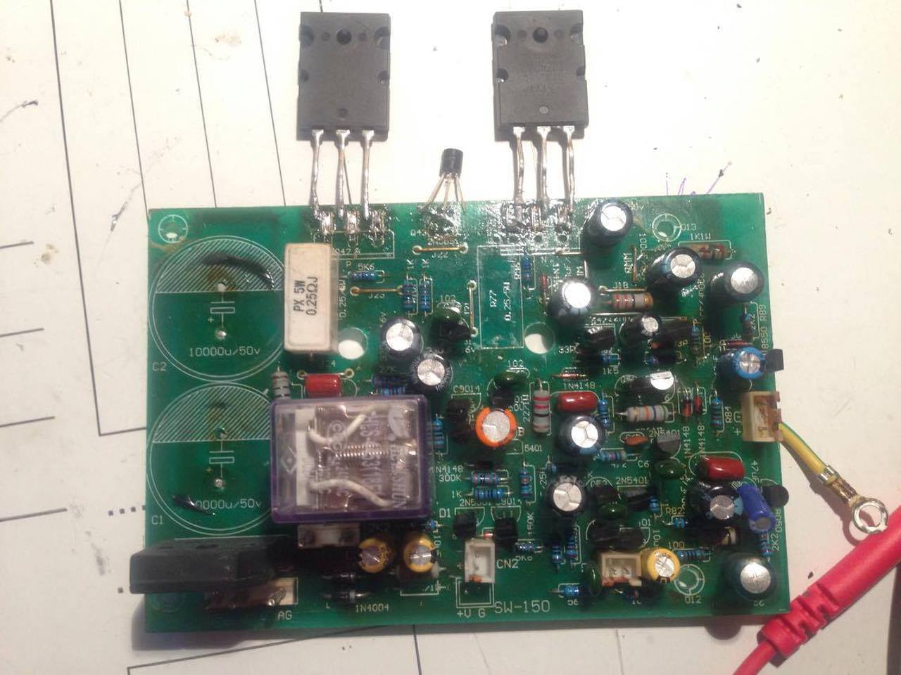 hali mindenkinek. lenne egy kis-nagy gondom. Valamikor régebben elhallgatott egy házi aktív mélynyomó. A hangszóró kiégett, de viszont az erősítő se oké. 2s5200 - 2sa1943 páros van benne, mértem és nincs bajuk. kondenzátorok ki lettek cserélve és úgy se. nos a tünet: bekapcsol gond nélkül, biztosítékot nem vágja ki. ám ha gyorsan tekerem a potenciómétert akkor a relé kattan egyet pár másodpercig pirosan világit, s aztán vissza zöldre. ha lassan tekerem a potenciómétert akkor tekerhetem maxra is, akkor se kapcsol ki, nem kattan a biztosíték. hang semmi nem jön. merre lehet a hiba? :-?? mellékelek 2 képet a nyáklapról.