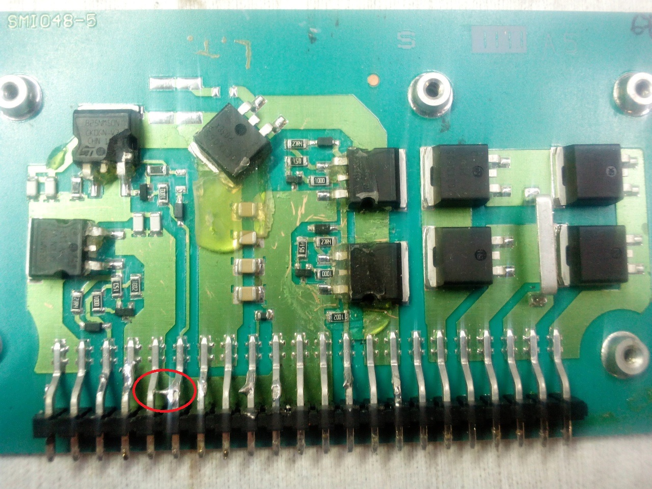 Vízszintes FET rajzon F4, felette F3 és a körülötte lévő ellenállás tranzisztor és a 2db dióda. Nem csak mérve hanem leszedve és cserélve. Átlósan dióda D6 és a jobb oldali két FET F1 F2 és a hozzá tartozó sallang nincs cserélve. Ezek a PFC-hez tartoznak és az a része működik. Bekereteztem a cserélt alkatrészeket.