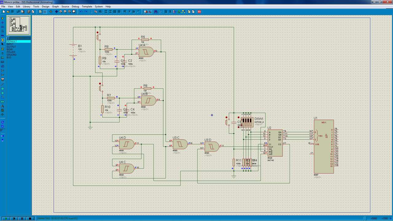 Proteusban szimulálok egy hangerő szabályzót, logikai kapukkal. Sajna valamilyen problémába ütköztem. A szimuláció futtatásban a 4029 fel/le léptetőnél nem jelennek meg a kimenetek. A bemenő jelek ott vannak, de sem a BCD kimeneteknél, sem a 7-es lábnál nincs jelem. Vele együtt a 4067-es multiplexernél sem jelenik meg logikai szint. Olyan, mintha nem kapna tápot. Bár maga a progi hozzákapcsolja, de nekem ez jön le. Vajon mi lehet a problem? Csatolta az eredeti képet és a szimulációt. Köszönöm előre is!