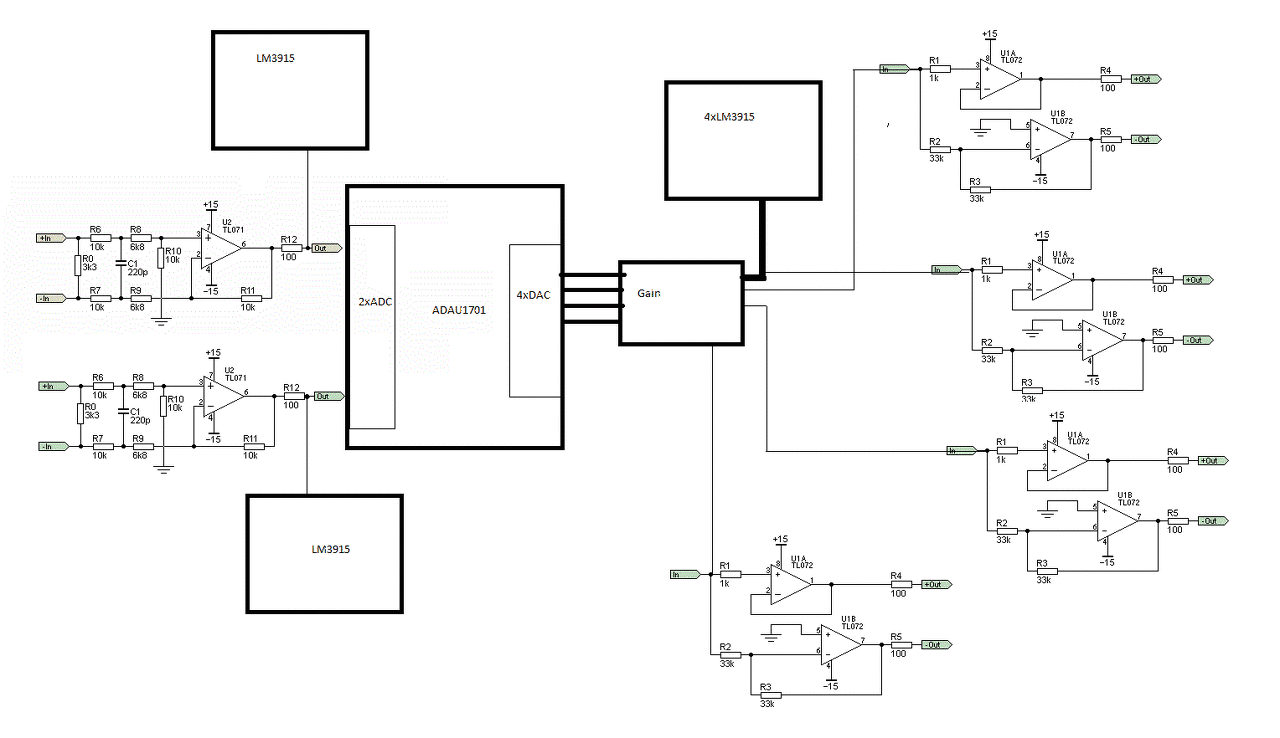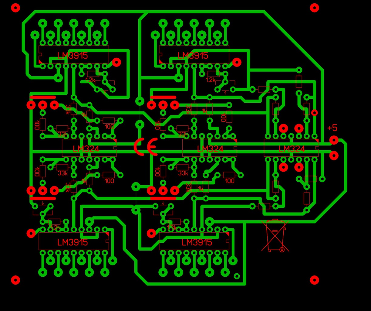 Egy ADAU1701 DSP ADC bemenetére kerül az LM358, mint Balanced to Unbalanced átalakító (Rod eliot féle rajz alapján), max 2V RMS kell az ADC bemenetre. A DAC 0,9V RMS-t ad ki, beraktam egy LM324-es IC-t ami nem invertált GAIN erősítést végez (az ellenállásokat még nem számoltam ki, mivel hogy nem tudom mégis elég volna-e 2V RMS legtöbb végfokot kivezérelni? ). Ezek után mind a 4 kimeneten egy LM3915 LOG VU-meter IC csücsül, illetve még két darab LM324 végzi az Unbalanced to Balanced jelátalakítást (ugyancsak Rod Eliot féle rajz alapján) Kapcsolási rajzom egybe nincs, de panelrajzom már van a tervemről, csatolom. Kiváncsi vagyok a véleményekre, és a kritikákra, ha netán találtok hibát a rajzon szóljatok. Köszönöm!